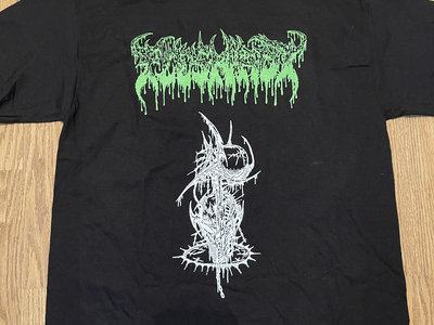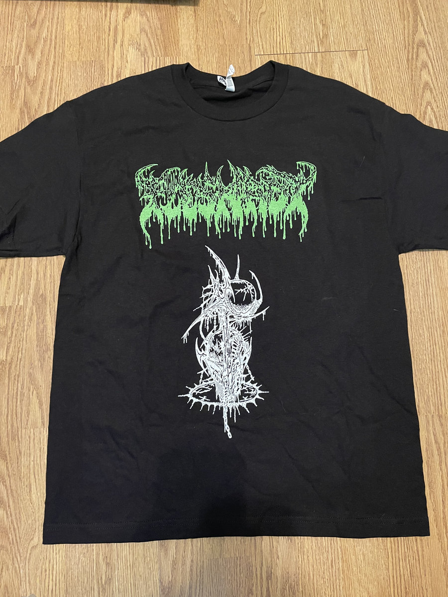 Black t shirt with a slimed out logo art work by Chamber Realm. Printed on alstyle.